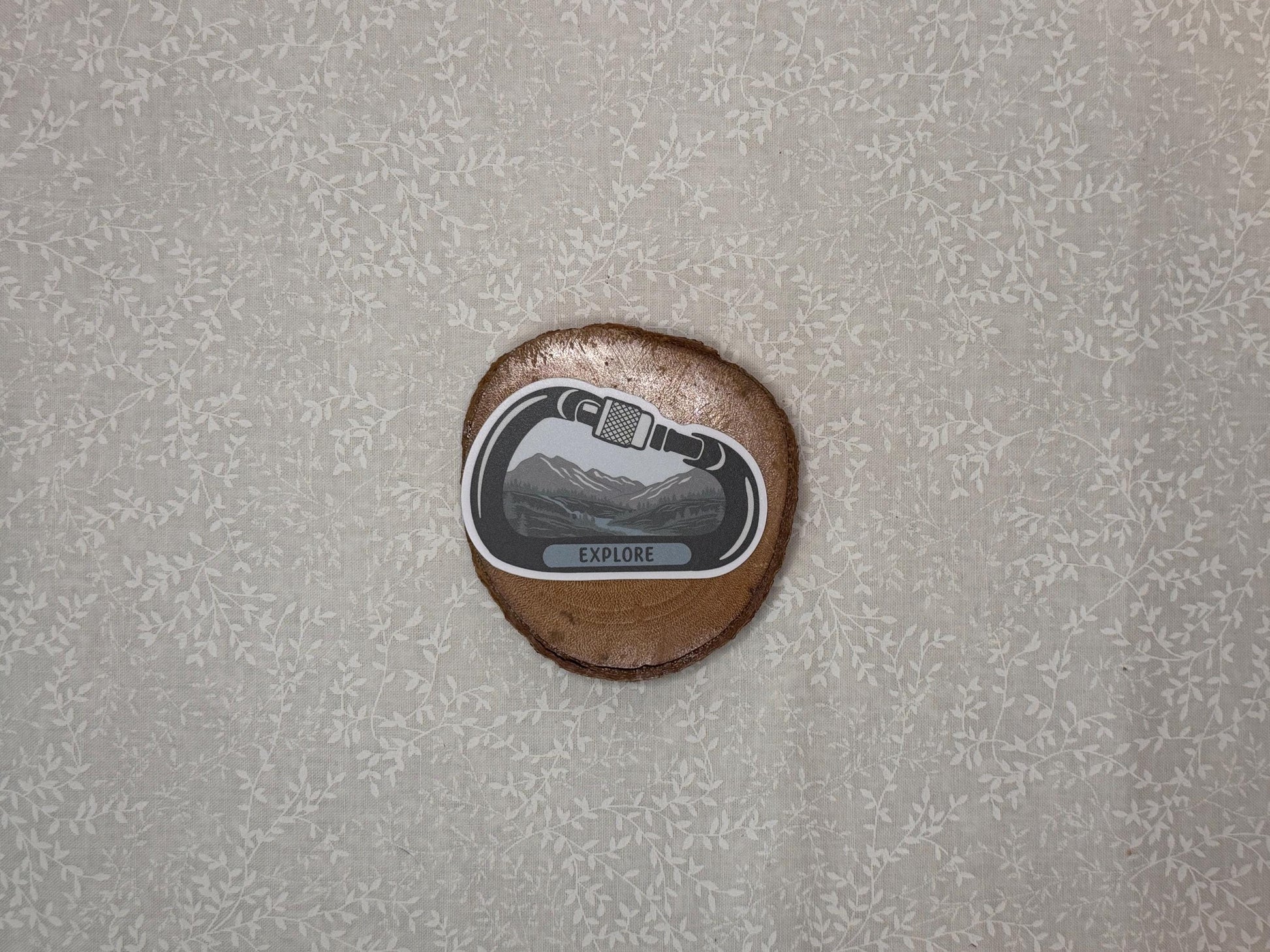 • White, die-cut vinyl sticker featuring a carabiner with the word "Explore" and a mountain range in the background