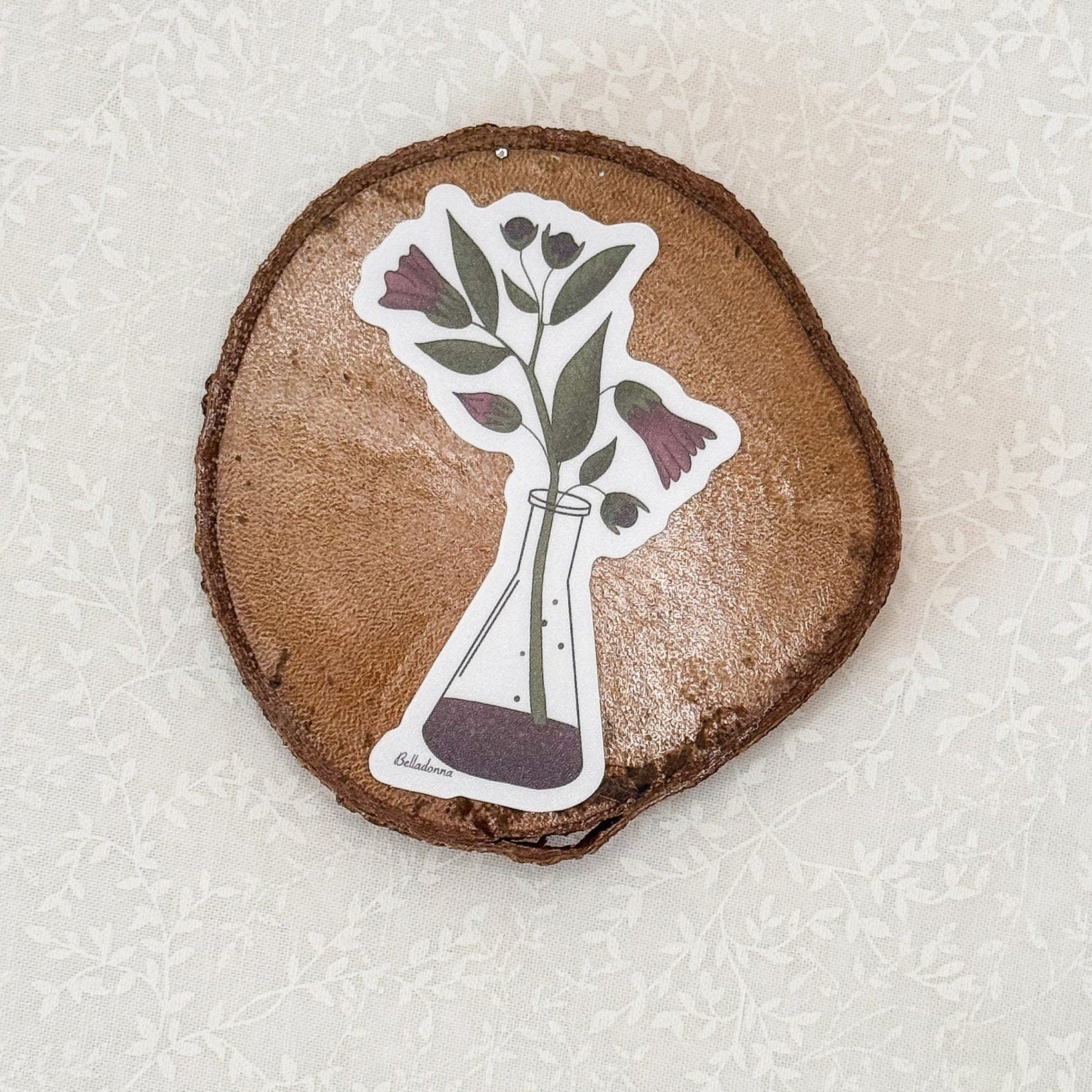 • White, die-cut vinyl sticker featuring either Wolf's Bane or Belladona in an Erlenmeyer Flask