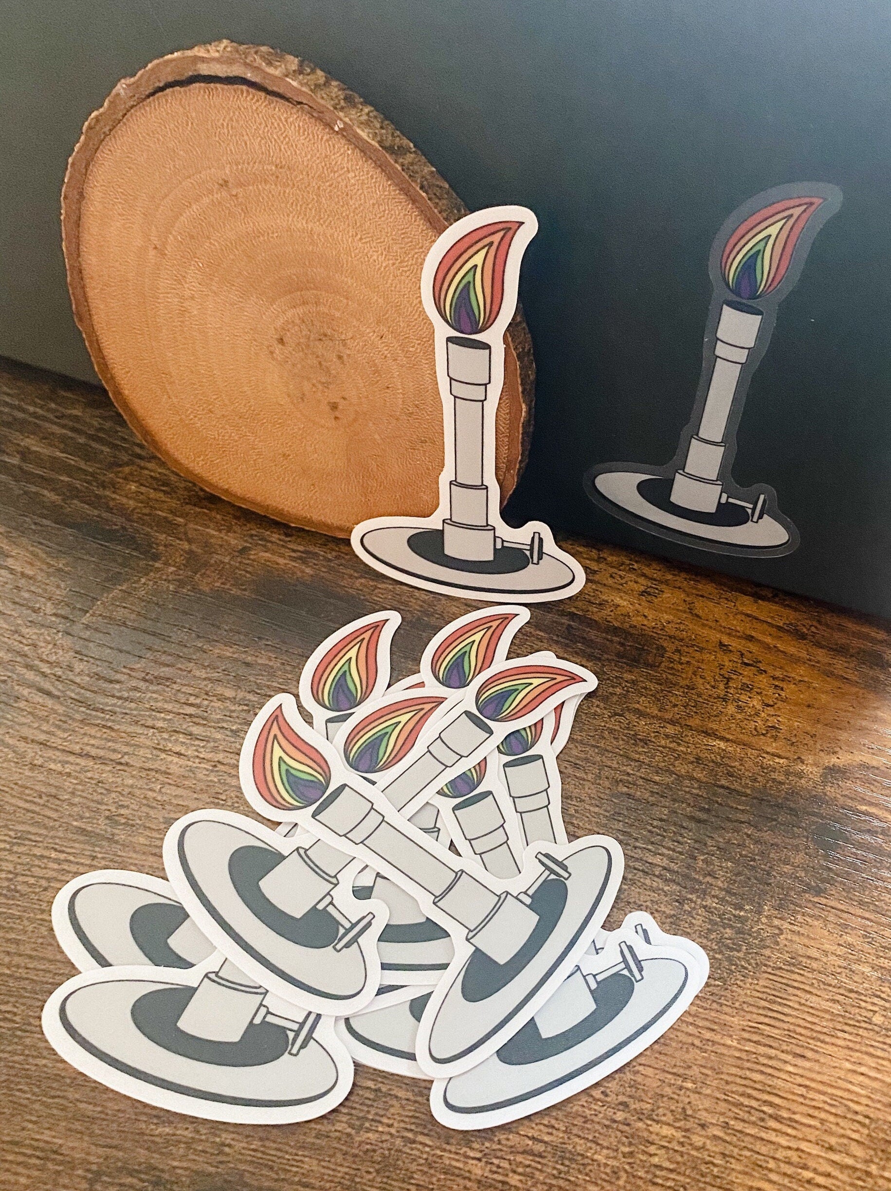 • Clear, die-cut vinyl sticker featuring a laboratory Bunsen Burner with a rainbow flame
